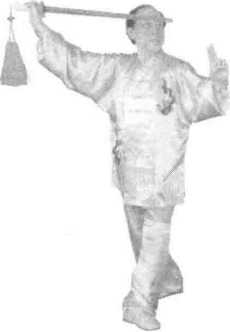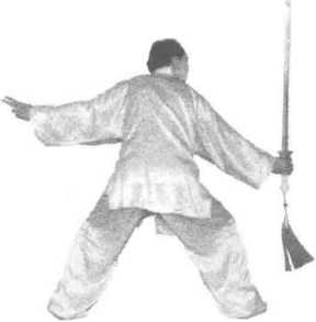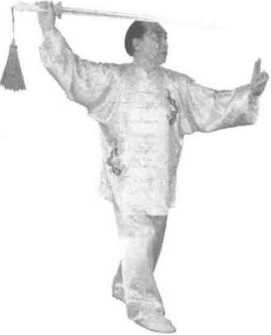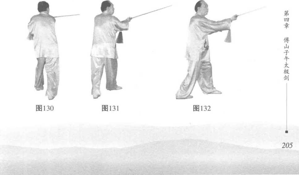 2. 上动不停,右手持剑上穿,右臂内旋屈肘、使手心向上,剑尖向右前方, 横置于肩前;左手扶于剑柄旁。同时,右脚抬起向前上步,左脚随之前行。然 后,两腿交替向右绕行一周,共行走七步(图129至图135)。