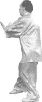 1. 左独立势:左腿独立,右脚屈膝提起向左腿后走弧,略停于左膝后;同 时,左手自左后经上、向前内旋划弧,停于胸前,掌心朝下;右手自右前而 下、向左划弧,停于胸前,掌心朝上。眼视右手(图35)。