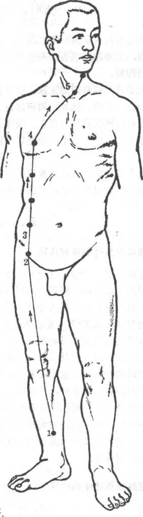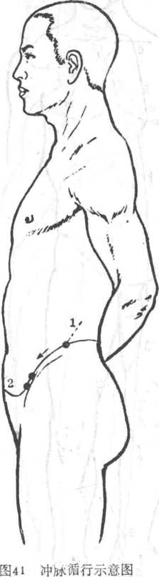 循行1.起于小腹内,下出于会阴部,2.向上行于脊柱之内,3.其外行者在小腹部 与足少阴经交会,4.沿着腹部两侧上行达咽喉,5.环绕口唇(图41 )。