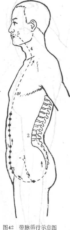 循行1.起于季胁部下面,斜叫下行到腰部,2.横行绕身一周(图.12)。