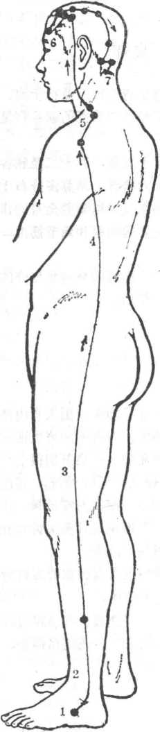 循行1?起于足跟部,2.向上出于外踩,3.沿足少阳经上行,经过骸关节,4.循胁 肋后侧,5?从腋后上肩,6.到前额,7.再到项后,合于督脉(图45)。
