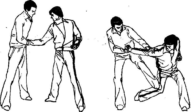 当对方用左脚挫我右膝时我应立即顺势下蹲用左手抓隹对方的左踝关节(见图4—156)用力将其上拉并将右腿屈膝上抬迅速用右膝下跪对方的膝窝可使其小腿疼痛迫使其跪倒在地上(见图4-157)