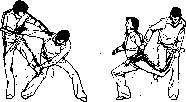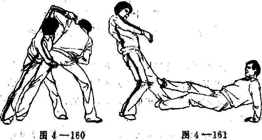 后掏我裆部时我应迅速向左转体并用左臂向后格开对方的左手(见图4—160),自己必须主动向右侧倒地避开掏裆立即用左脚勾住其左踝关节同时用右脚迅速蹬其左小腿前侧使其别腿而倒地(见图4—161)