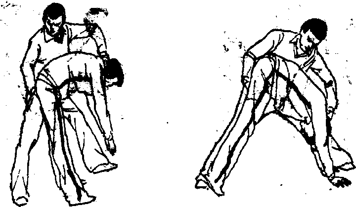 当对方用头向我撞来时我迅速上右脚一步避开头撞后立即用左手从后按住对方的颈部用力向下按同时右手由其臀后向裆部掏拉(见图4—158),利用下按上拉之力使其身体前倒也因其裆部被揭而不能动弹(见图4一159)