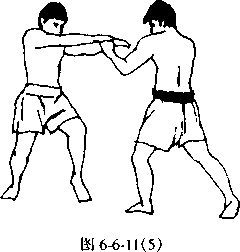 为乙推带甲右前臂时,甲左手前顶乙右肩控制距离或退出见 图6-6-11中的图(5)。