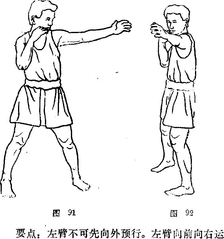 图93錄近掌根部,左拳仍置下颚前, 然后还原成实战姿势。" ^ 动作说明: