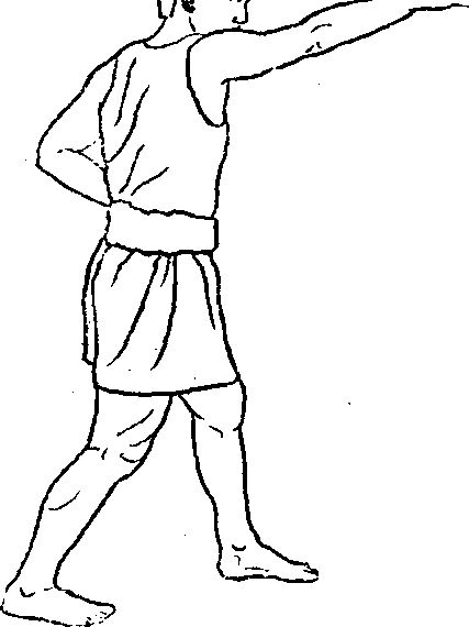 实战姿势开始办 右脚蹬地,前脚 掌碾地,脚跟略 抬外转,上体左 转,身体重心移i 至左脚,同时,右丨 拳变掌,右臂向丨 前,向左横击。i 掌高与头乎,掌丨 朝如,掌心朝丨 左,力达小指侧i 目视右拳(图93)。|