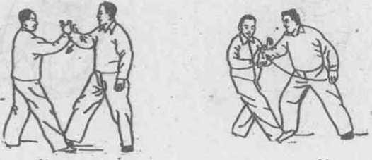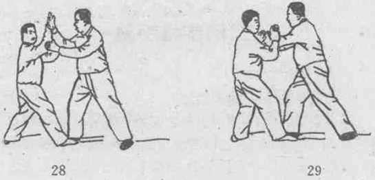 ⑨ 定步推手换手法:在乙用右瞥向胸前挤来时(参看定步 推手图21),甲不用向前按的动作,而顺势用左手领乙之左手, 同时右手捋乙之左肘部?身体略左转,改为捋乙之左臂的动 作。(图29)