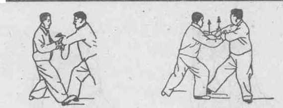 动作:①绷劲(开始姿势):双方各用右臂作单搭手式.各 含绷劲.(图19)