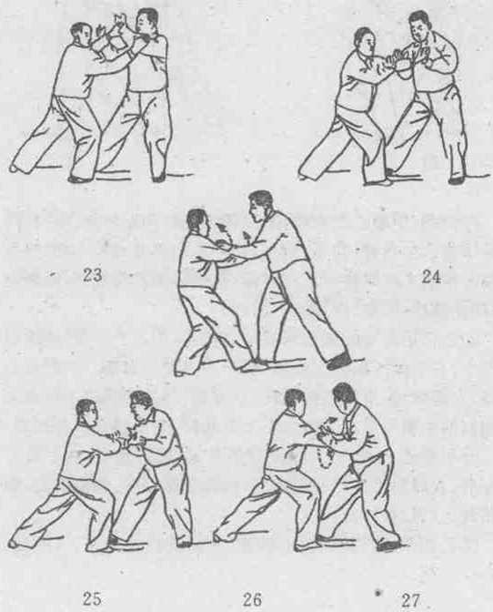 ⑤ 乙仍用左臂的绷劲承接甲之按势,用左手手背.接承甲 之左手,右手由下面向右绕出,抚于甲之左手肘部.同时重心 后移,左腿弯屈,身体略向左转.左臂绷住对方按势(不可直向 后缩),两手引甲之左臂略向左上方回捋,变成捋式.(图23)