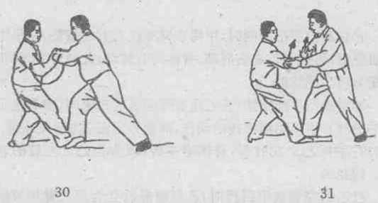 当乙的左背被甲回捋时.乙应顺势改变为用左臂接着做 挤的动作.右腿仍前弓(图30)。当甲化开乙挤势变为按时,乙 左臂再由左下方绕出,抚于甲右肘部,身体后坐.捋甲方右臂; 甲随即变为按式。(图31)