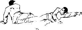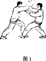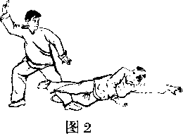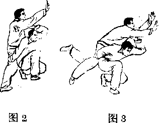 死里逃生 武术传统技击方法之一。敌将我摔倒在地,我即以双腿将敌之左腿夹住,以金剪绞式将敌摔闽;此外,亦可以左脚腕勾住敌左脚后跟处,以右脚跟蹬踹敌左腿胫骨,使 敌后跌,我从而脱身(图1、2)。要点:勾别敌腿要出其不意,迅速稳准,一举成功。 老僧驼米上仓 武术传统技击方法之一。敌以右掌击我面 部,我即以两掌掳抓敌腕臂前带;同时,身体向右后转,两 腿屈膝下蹲,将敌背起向前跌出(图1、2)。要点两掌抓掳前带与下蹲前跌要从容不迫,一气呵成。