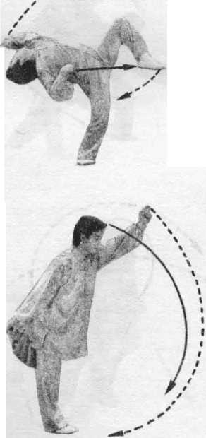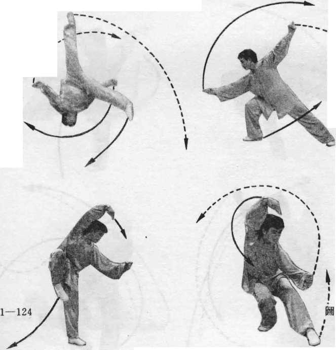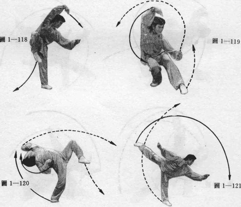 (1) 左脚向前落地,左腿伸直,上身随 之向前侧倾,右腿同时向后摆起;左握杯拳在 随上身向前侧倾的同时,直臂从后向上、向前、 向下弧形下沉,右刁手变拳,随上身向前侧倾, 从右腰侧直臂下垂,并向后、向上弧形上举, 开始侧翻(图1 一121)。
