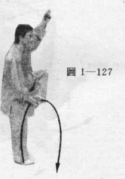 (i )接上动,上身直起,左握杯拳随上 身直起之势向上举起,右手向前抓住左脚,馓 向内收;目砚前方(图1一127)。