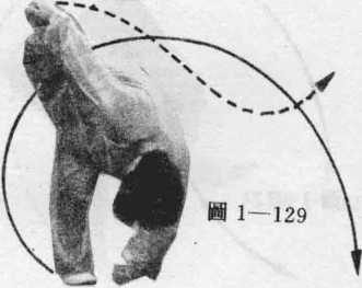 (1 )接上动,上身前术,左拳随身体前 俯之势向K、向里弧杉下沉,以拳背扶地,开 始做前滚翻(图1—129)。