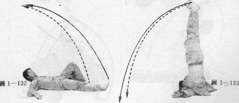 西方(图1—131)。 (2 ) t.动不停,收腹使两腿向上举起,&? 颈展开,以头肩着地,成倒立姿势(图1 一133