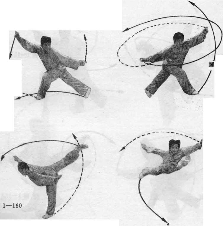 (4) 上动不停,上身继续向左拧转,左 脚蹬地跳起,向身体后上方襬起,身体悬空(图 1—161)。