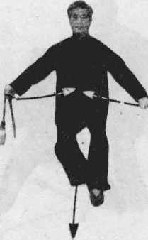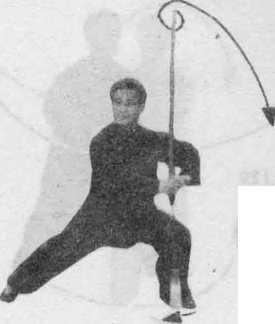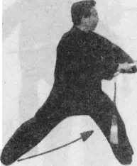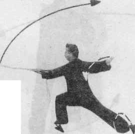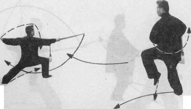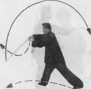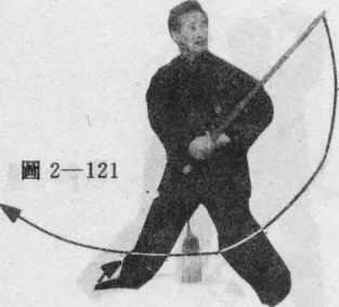 右手向左下方划弧时,稍提腕,剑尖不可 触地,但要防止耸肩。刺剑与弓步要协调-致。