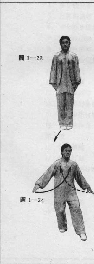面南①立于拳场西端,两腿伸直,两腿靠 拢;两臂垂于身体两侧,两手五指并摆贴在腿 侧,成立正姿势(图? 1 —22)。