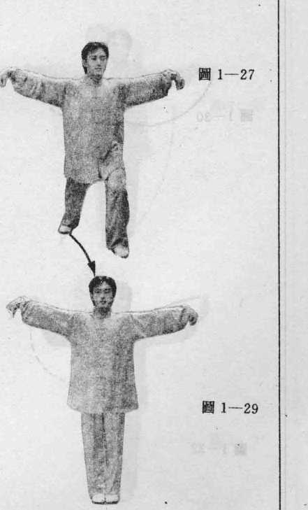 (3) 上动不停,右腿直起,左脚从后向 前上步与右脚并拢靠紧:两腿伸直;两臂侧平 举,两手变钩手,、钩尖朝T?(图1 一29)。