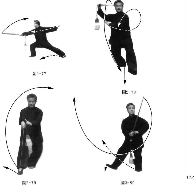 ,重心右移,左脚提起落于 身前,脚跟着地,脚尖翅起,左腿微屈膝;同 时,右手持剜臂外旋屈肘,使剜尖向身岌割 弧,奉于身右侧,翁刃朝上,剜尖朝岌,手心 朝左,高不;左手剜指屈肘向右割弧至 右臂前,手心斜朝下;目平视前方(圈2-78)。