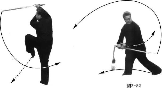 下向右后方弧下截。臂自然伸 直剜尖斜朝下;左手剜指向右割弧,屈肘附于 右肩前,手心斜朝下;目视剜尖(圈2-84)。