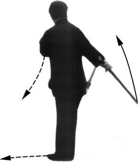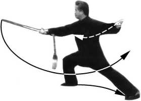 点剜时,腕部用力,使力建于剜尖。点 剜与虚步、左手割弧要嫁一致。身体保持 正直。虚步和点剜方向与起势方向相同。