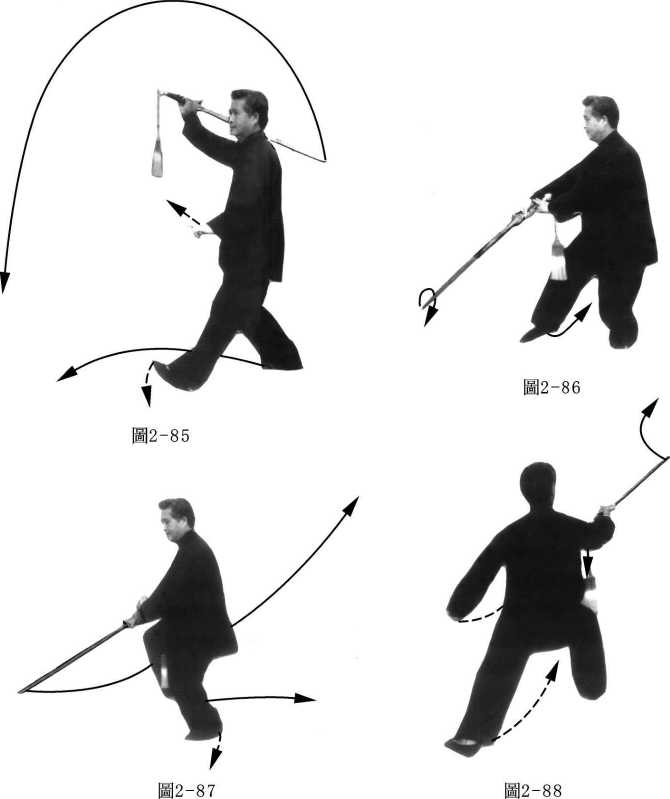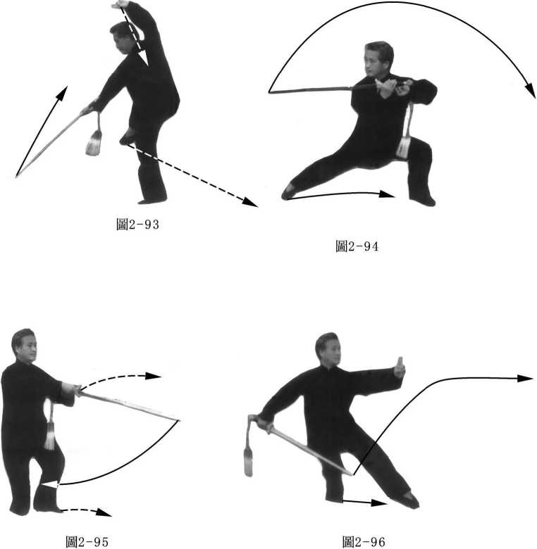 (1) 身体左1,重心前移,右脚提起向前 跟半步,先以脚掌着地,随重心渐渐移向右 腿而至全脚踏;同时,右手持剜使剜尖 上向前割弧,提腕使剜尖向前下方点击,腕 同胸高,力建剜尖,剜尖低于腕;左手剜指仍 附于右腕内侧;目视剜尖方向(圈2-95)。