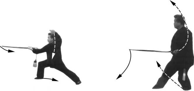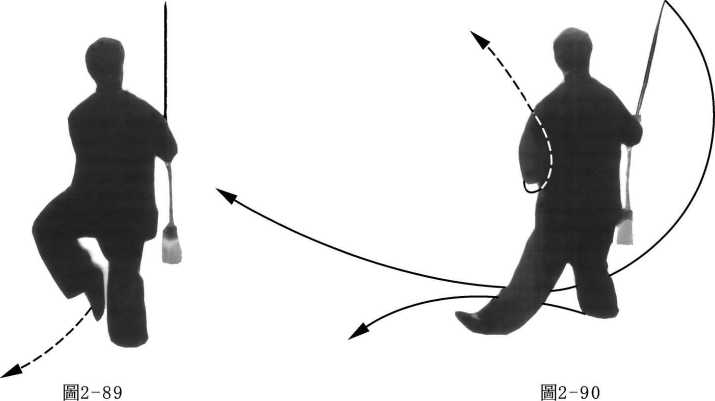 (1) 随重心全部移于右腿,左脚提起,脚 尖自然下垂;同时,右手持剜以腕