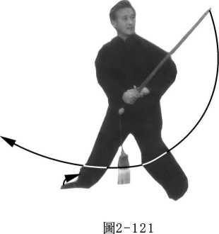 右脚尖裹扣踏重心全部移于右腿,身 体略左左脚提起发再原位置落下,身体重 心再移至左腿,左腿屈膝,右腿自然伸直成左 横弓步;同时,右手持剜屈肘臂外旋向上、向 左割弧至左胸前,手心朝发,剜尖朝上;左手 剜指屈肘附于右手腕部;目向右平?( 2- 126)。