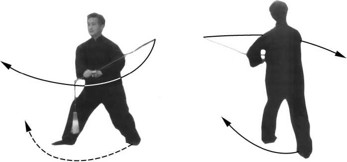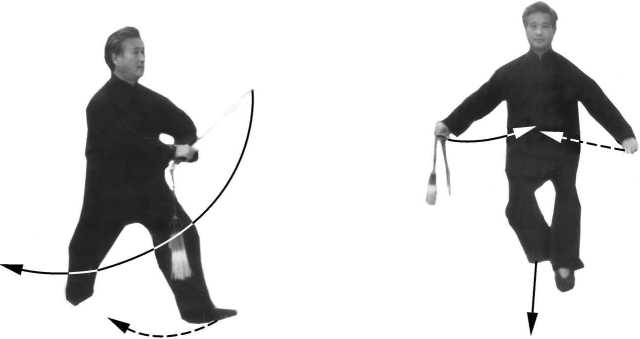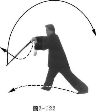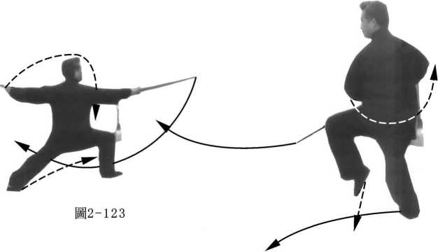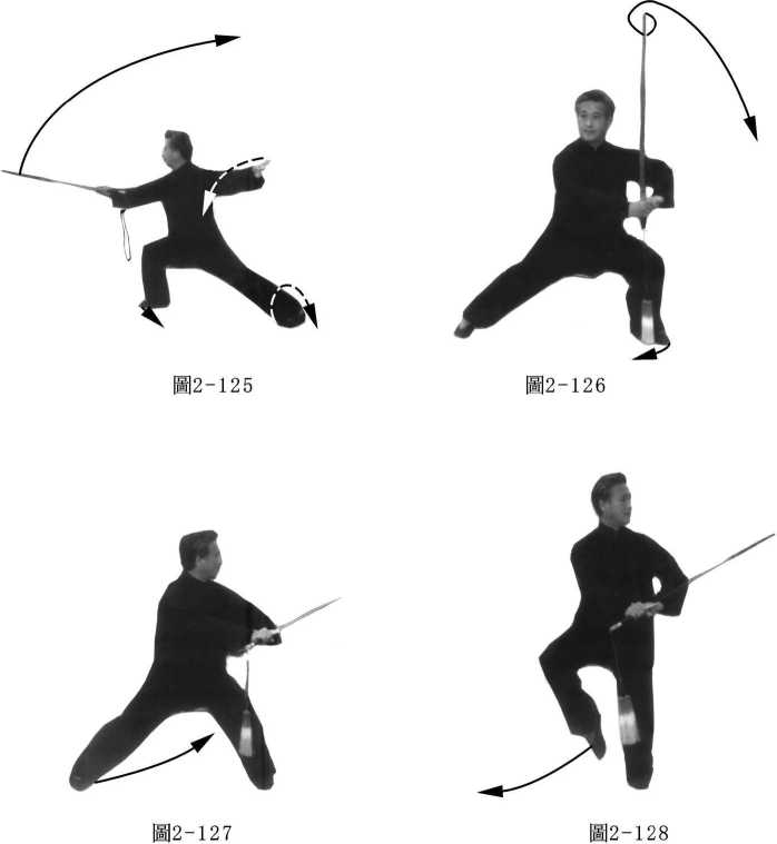 (1) 右脚尖裹扣踏随重心全部移于 右腿,身体略左事事,左脚提回;同时,右手持 剜使剜尖向下、向左割弧,臂外旋屈肘收至 右腰侧,手心朝上,剜尖朝左下方;左手剜指 向上、向右割弧,屈肘于右胸前,手心朝右; 目平视左侧( 2-124)。