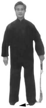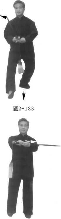 右脚踏重心前移,左脚向前上步,两 脚平行站立,两腿自然伸直,与肩同宽;同时, 两手捧剜向前平剜刺出,力注尖手心朝 上,高于胸平,剜尖略高于腕;目平视前方 (2-134)