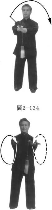 (2) 上勤不停,左手按剜,右手变剜指臂 外旋,两手同时分至两肩前,手心皆朝上, 剜柄和指尖朝前;目平视前方(图2-136)。