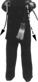 (3) 上勤不停,两臂慢慢向下臂内旋经左 右向前!弧;同,左手持剜以腕舄聿由,使剜 尖在身左侧由岌向上、向前、向下,再向岌立