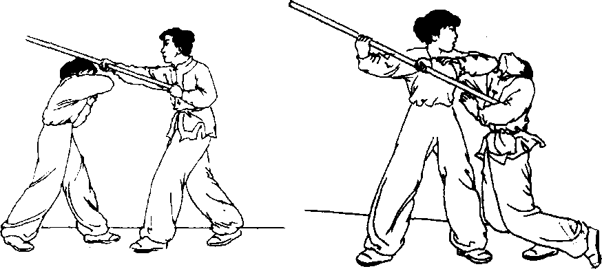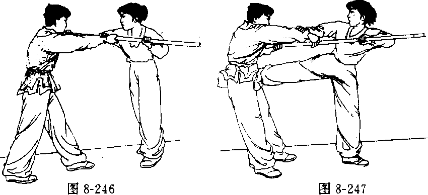 对方在我正前方,两手持棍,戳我胸部。我迅速向左转体 90度,侧身闪防;并顺势以左手抓住对方棍的前端,右手抓住 对方手腕向左侧用力拉带。随之左腿支撑身体,上体向左侧倾, 右脚猛力向右侧踹击对方肋部(图8-246、8-247)。