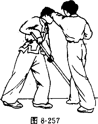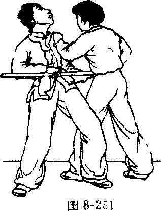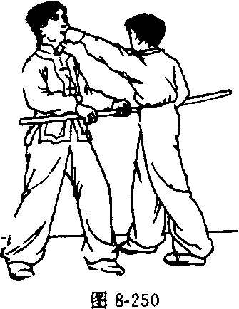 对方在我正前方,上左步,两手持棍劈打我头部。我迅速 向左前方上左步,稍向右转体侧身闪防;并顺势以右手抓握住 对方棍的中部,向体右侧拉带。同时,左臂弯屈上抬,以肘关 节向前左侧顶击对方下颌部(图8-248. 8或49)。