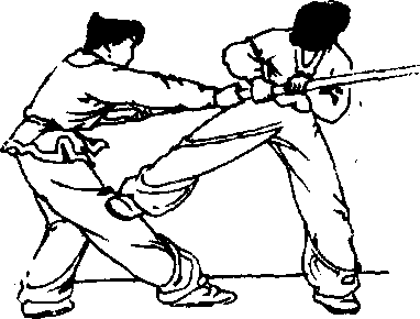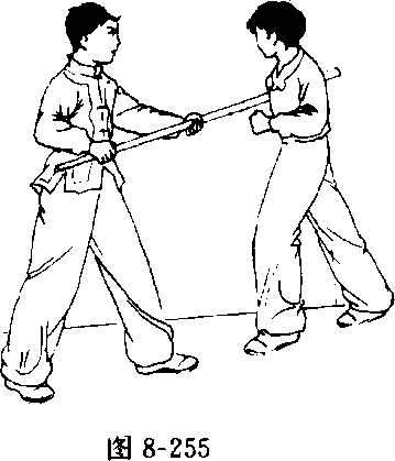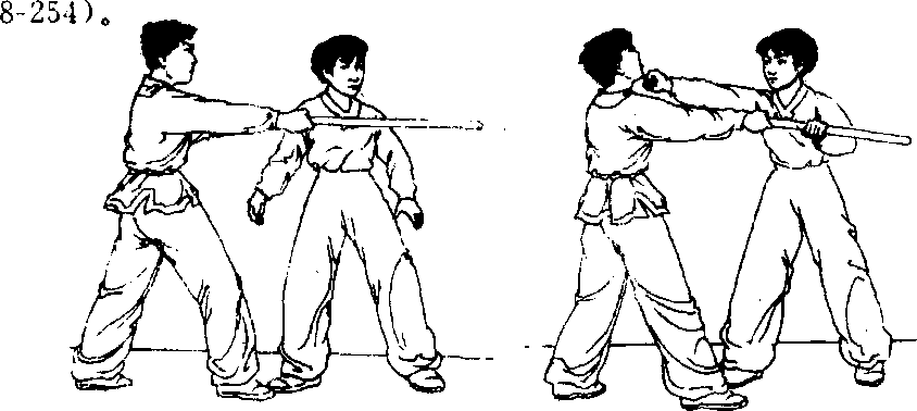 腿支撑身体,以名腿向右蹬踹对方右膝关节处(图8-252.8-253.