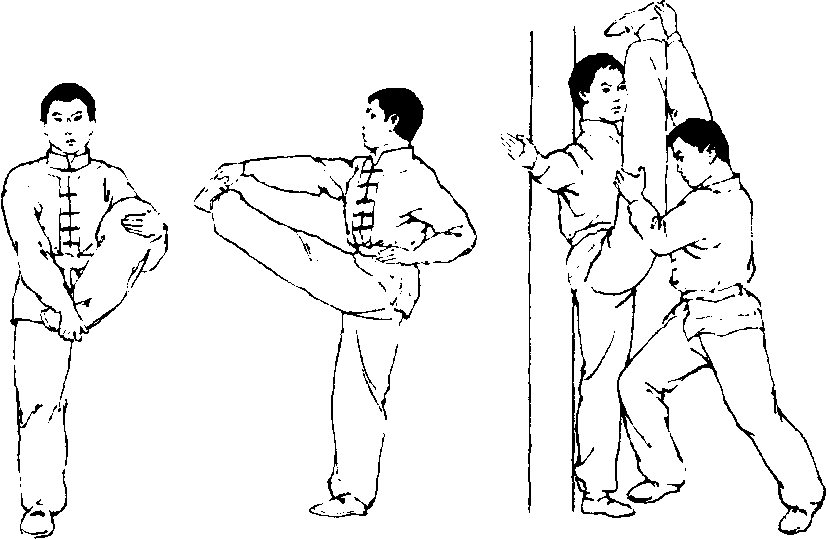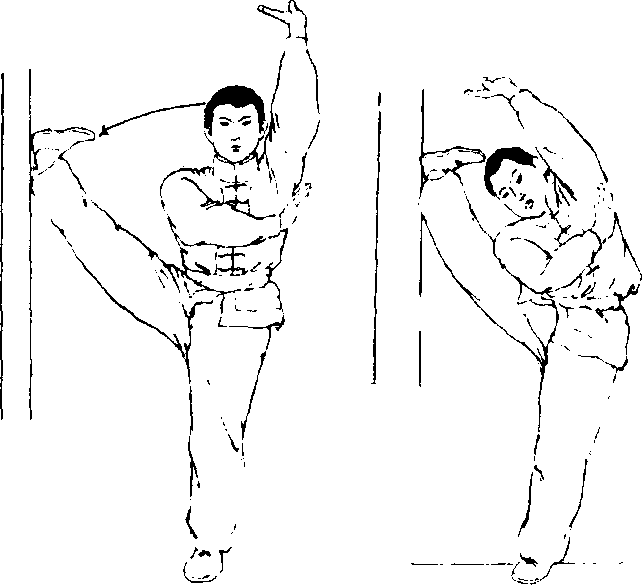 练习方法:右腿挺膝伸直站立,左腿屈膝向上提起;同时, 左手抱左膝使之尽量靠近胸部,右手握左脚背,使之尽量绷紧 (图4-100).这样静立、上搬数秒钟后、使提膝的左腿向前上方 挺膝伸直上举,高与腰平;同时,左手叉腰.右手抓握左脚尖. 使之尽量勾起(图4-101).如果有同伴帮助,练习者可背靠木 柱、大树或墙壁,两手侧平举或抓握住器械.以维持身体平衡。 同伴一手托住练习者一腿的脚跟,另一手扶持其大腿外侧或膝 关节处,做一上一下的推压动作(图4-102)。练习时,两腿交 替进行。