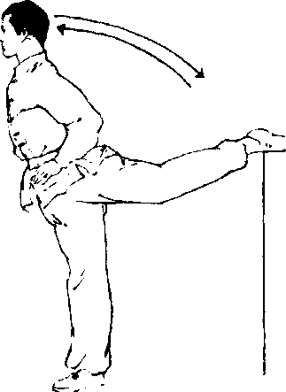 练习方法:身体侧对桌、凳、窗台、树木、台阶、肋木等 一定高度的可支撑物体。一腿挺膝伸直,脚尖朝身体的正前方,