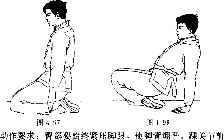 臂自然下垂,脚背绷平,臀部坐于脚跟上(图4-97)o然后,两 手向后支撑,身体后仰,臀部紧压脚跟处,两膝上抬(图4- 98)。坚持一会后,再恢复图4-97姿势,反复练习。