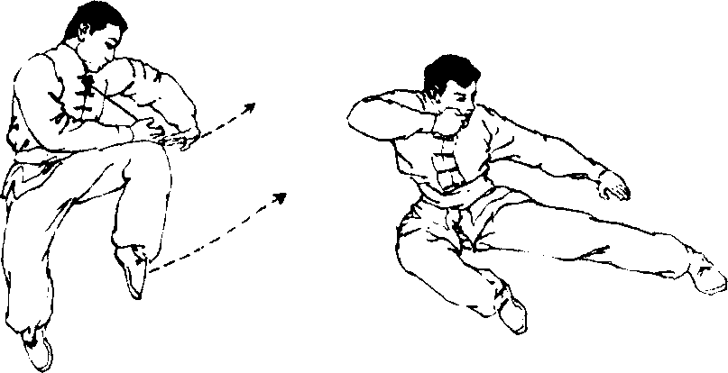 右脚猛力蹬地跳起,左腿屈膝上提。同时,左掌不动,右掌变 拳屈肘回收,目视前方(图4-176)。上动不停,在腾空的最高 点.左腿挺膝向左侧踹出,上体向右侧倾。同时,右拳收于右 胸前;左掌向左侧横击,力达掌外沿,目视左脚(图4-177)。