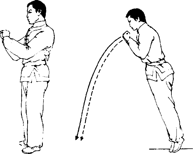 练习方法:两脚并拢,身体直立,两臂屈肘,握拳收放胸前, 目视前方(图4-192)。接着,身体保持棍状直立,向前倾倒,脚跟