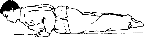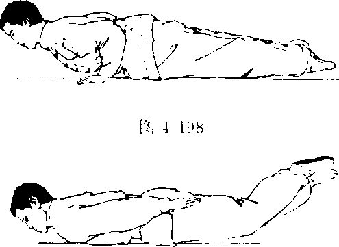 胸,目视前下方(图4- 196)。上动不停,两掌向前 落地,屈肘使胸腹部和大 腿依次着地(图4-197. 4 198)。亦可借身体向前的 惯性,两手扒撑地面,抬 头挺胸,以胸腹部着地,使 身体向前滑行一小段距