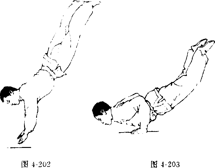 停,身体继续向后仰翻,两腿迅速伸直上摆,两掌随之落地成 倒立姿势(图4202)。上动不停"两臂逐渐屈肘,抬头挺胸,使 胸、腹、大腿依次着地(图4-203. 4 204).