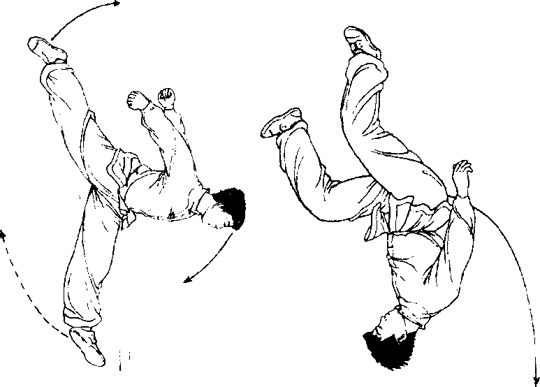 练习方法:两脚并拢,身体直立,两手自然下垂成立正姿 势。接着,重心前移,左脚快速向前上步.猛力蹬地向前上方 跳起,右腿向后上方撩摆,两臂随之向后、向上、向前摆动 (图4-218)。上动不停,身体在空中,低头、含胸、收腹.团身 向前空翻180度(图4-219)。上动不停,身体继续向前翻转.两