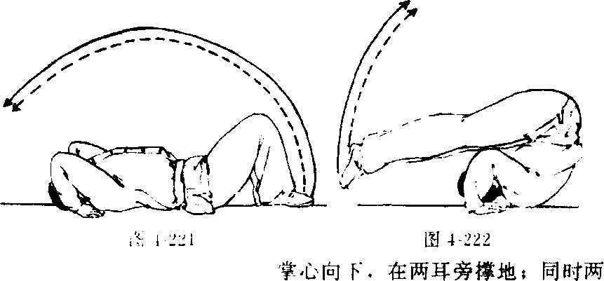 膝,脚前学和肩背同时着地, 便腰部悬空(图4-220)。