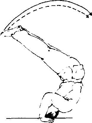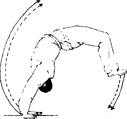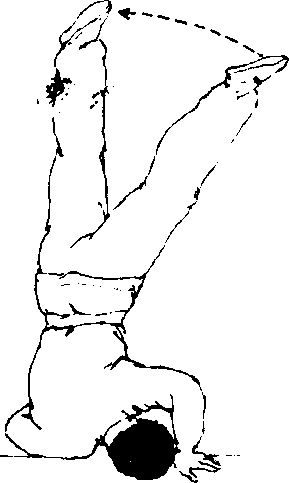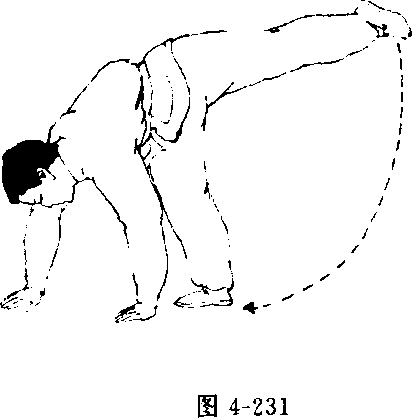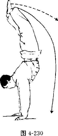 不停,右腿继续向后、向上扫 摆。当右腿扫经面部再继续外 扫时.左腿跟着从右向左、向 后、向上扫摆,以右侧肩背撑 地,两腿在上方相绞;同时,左 掌屈肘在左侧面部前撑地成右 肩背倒立(图4-229)。上动不 停,头颈上顶.身体上引,两 臂用力撑地伸直;同时两腿伸 直并拢成手倒立(图4-230)。 接着,屈髓收腹,使右脚领先