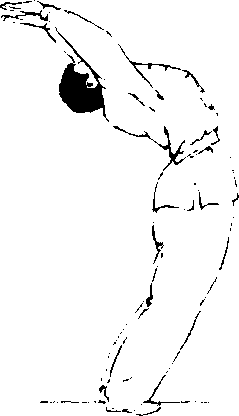 身体重心稍后侧;两脚一着地,即挺身立腰.抬头跟肩.两臂 上举站稳(图4-225)。