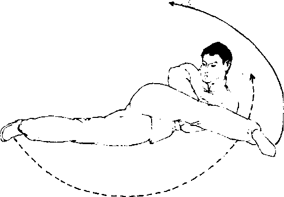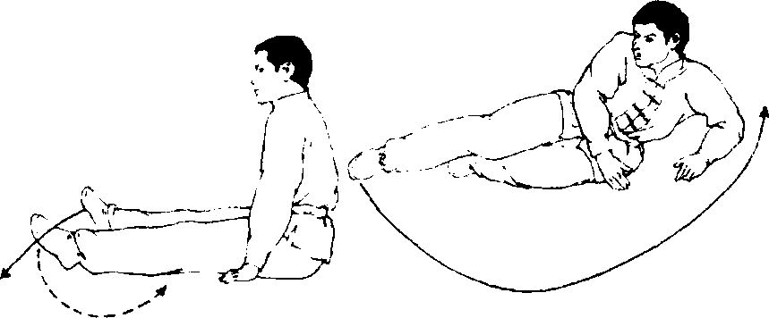 腿并拢,屈膝回收,两脚掌着地,使 大小腿约成90度(图4-221)。接 着.收腹屈体,使两大腿伸直向后 上方举起;臀部上抬,以两手和肩 背部支撑地面(图4-222)。上动不 停?两腿伸直,快速展髓、挺腹,用 力向上、向前、向下鞭打振摆,同 时两手用力推撑地面(图4-223. 4- 224)。上动不停,伸髓挺腹,两腿