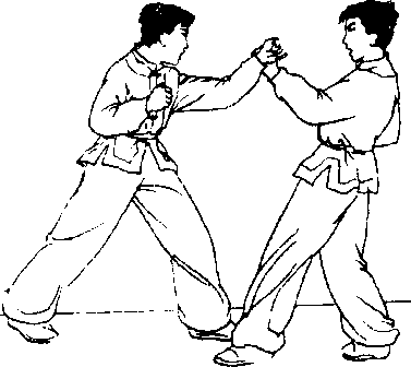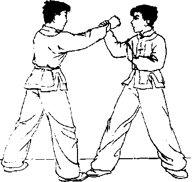 图 5-101图 5-101接实战预备式,我以 左直拳击打对方面部,对 方以左手拨防;我再上右 步,以右直拳击打对方面